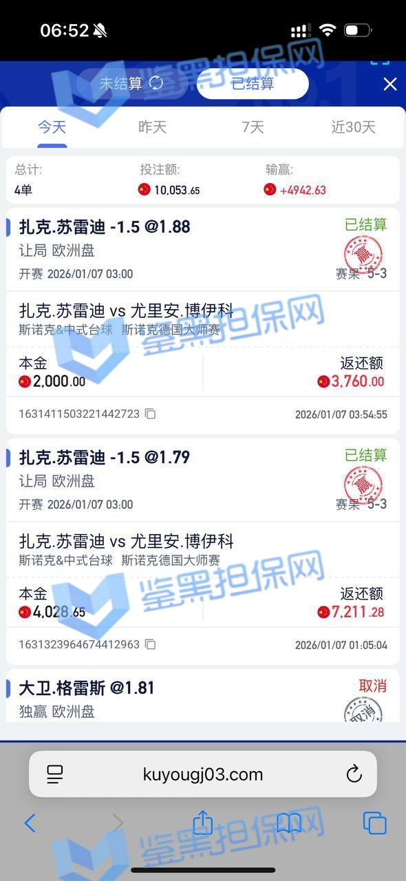 老子在酷游国际玩了两个月,百家乐、体育啥都玩,存取款一直顺顺当当,从没搞过套利,也没领过什么狗屁彩金,就拿点反水奖励。结果2026年1月6日凌晨一申请提现,账号直接被冻结,余额13000全卡死,登录都登不进去了!客服牛逼哄哄就甩一句“账号违规”,老子问到底哪违规了?死活不说清楚。我他妈玩得光明正大,近两天就投了百家乐、足球、篮球、斯诺克,全是正常初盘下注,哪来的违规?赢钱故意黑钱不出款坑人